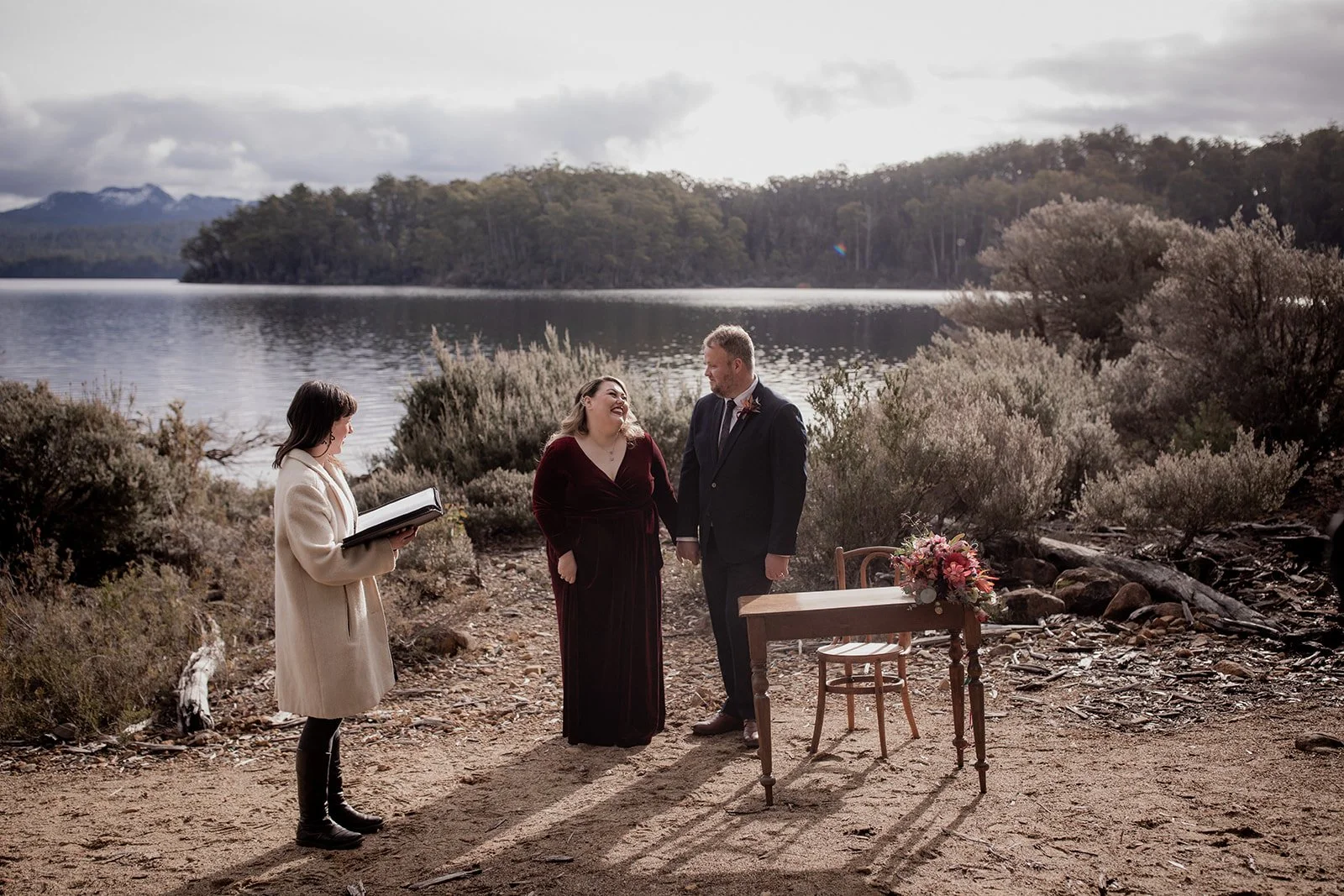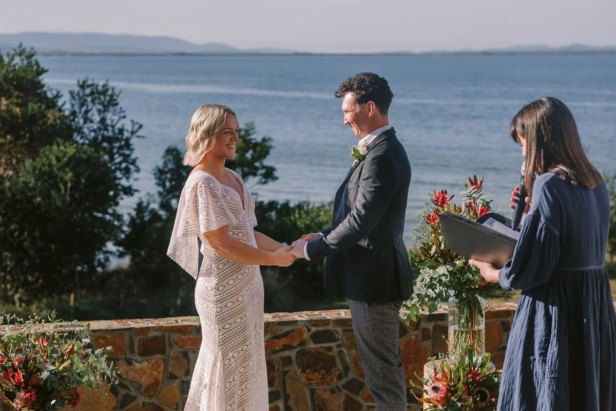 The whole process was so easy despite us living in Sydney while we planned for our Tassie wedding. We spoke on Zoom a couple of times in lead up and all got to know each other. Beth had us complete a detailed questionnaire which helped with the creation of our ceremony. We were able and encouraged to customise our ceremony as much as we wanted and her suggestions were great and so fun. Beth came to our venue the day before the wedding during bump-in and did a rehearsal with us. She was so helpful in helping us decide how to run things in the event of inclement weather.
